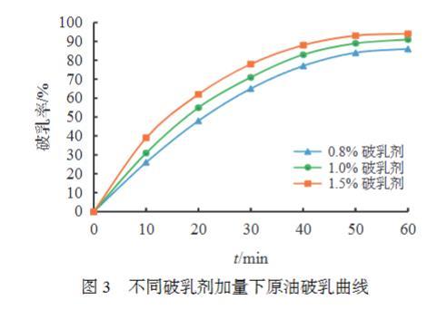 圖3不同破乳劑加量下原油破乳曲線