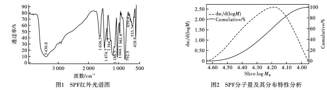 1)SPF紅外光譜分析(IR)SPF紅外光譜結(jié)果見圖1,3430.8cm?1為羥基伸縮振動峰,這不可能是醇羥基,而是酚羥基。3000cm附近有一個(gè)小峰,在1474.7cm是亞甲基變形振動峰,說明SPF中含有亞甲基。1636.5cm是苯環(huán)上的C=C鍵伸縮振動產(chǎn)生的特征吸收峰,在指紋區(qū)中的792.5cm?1區(qū)域中的譜帶是取代苯的1,2,6取代的特征吸收峰。1186.5cm?1和1044.1cm?1是由于S=O鍵伸縮振動產(chǎn)生的特征吸收峰,在700—500cm?1的連續(xù)吸收峰是S—O、S—S、C—S鍵伸縮振動產(chǎn)生吸收峰。SPF產(chǎn)物的分子中含有磺酸基、羥基和亞甲基等官能團(tuán)。