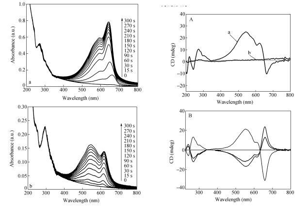 以CODA為例,隨著紫外光輻照時間增加,LB膜在590和640nm處出現(xiàn)2個典型的聚二乙炔藍相吸收峰,且隨時間增加而逐漸增強,薄膜顏色由淡黃色變?yōu)樗{色。而對于CO2DA LB膜,隨著254nm紫外光輻照時間的增加,在540和620nm處出現(xiàn)兩個明顯的吸收峰,分別對應(yīng)于聚二乙炔紅相和藍相的典型吸收,薄膜顏色由淡黃色變?yōu)樽仙kS著輻照時間的增加,540nm處吸收峰明顯增強,聚合薄膜中聚二乙炔紅相組分變多。