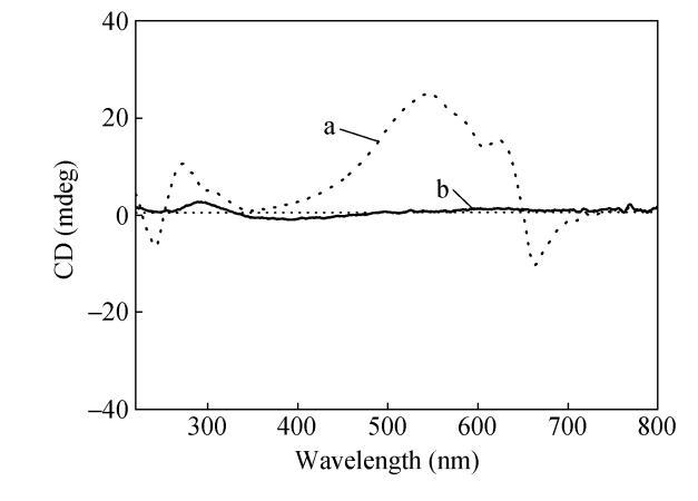 香豆素基團在紫外光照條件下可發(fā)生可逆的光二聚反應(yīng):在365nm光輻照下,香豆素基團能發(fā)生光二聚反應(yīng),在254nm輻照下香豆素二聚體能可逆地發(fā)生解二聚反應(yīng)。可以預(yù)見香豆素端基的二聚化將影響香豆素取代二乙炔單體在氣液界面的組裝,從而影響聚二乙炔主鏈螺旋結(jié)構(gòu)的形成。我們用365nm紫外燈輻照CODA氯仿溶液20min,此時香豆素端基能發(fā)生二聚,而二乙炔基團不會發(fā)生聚合。將得到的CODA二聚體的氯仿溶液鋪展在水面上,沉積制備LB膜,制備得到的CODA二聚體LB膜能聚合成藍相。CD光譜測試發(fā)現(xiàn)香豆素基團和相應(yīng)的聚二乙炔吸收帶均出現(xiàn)了明顯的CD信號,但強度較CODA LB膜均有所減弱,如圖8所示。