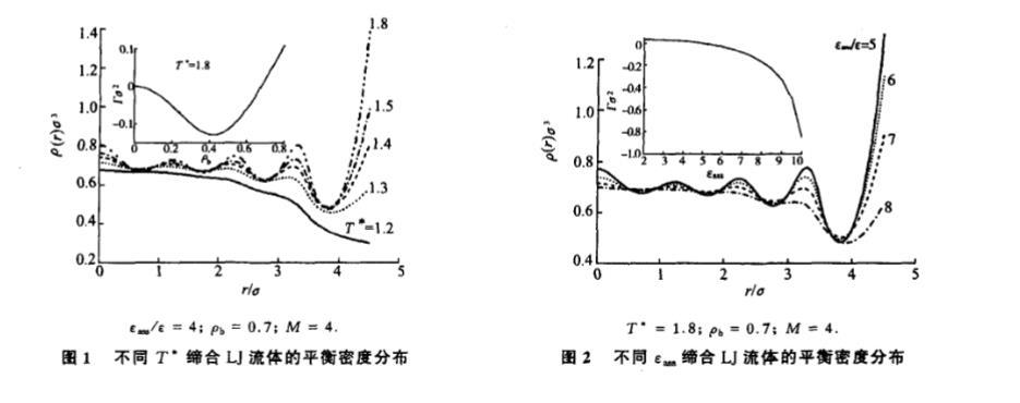 就非均勻體系而言,分子間 的排斥體積作用是使得密度呈振蕩分布的主要原因。然而,圖 1,2 表明 T 和 ε 也在很大程度上影響著體系平衡結構。圖 1 中,密度分布曲線振蕩幅度隨著 T 的降低而衰減,且當 T=1.2 時,曲線的振蕩趨勢幾乎完全消失。原因在于 T 越小,分子的無規運動能力越弱,分子間比較容易發 生締合并形成尺寸較大的團簇結構。在平衡態下,體系的最大構象熵要求這些團簇結構向體相轉移,從而導致密度分布曲線振蕩趨勢的削弱和接觸密度的降低。然而,一旦增大 T*,分子無規運動能力的增強使得分子間很難形成穩定的締合結構。這在某種意義上降低了分子的締合能力,從而使分子間的排斥體積作用在更大程度上決定體系的平衡結構。