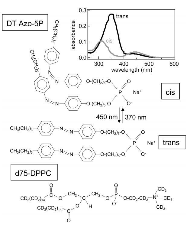 圖1。 順式和反式構型的光開關脂質DT Azo-5P和d75 DPPC的分子結構。 右上角的插圖顯示了CHCl3中DT Azo-5P的紫外/可見光譜( ~ 在370nm(順式狀態)和450nm(反式狀態)下輻照約10s后,使用7μM,1cm的反應杯。