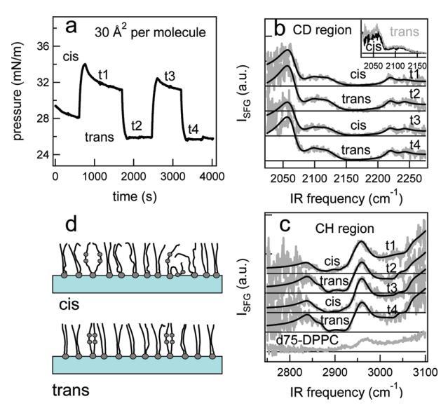 圖7。在脂質/H2O界面處,DT Azo-5P/d75 DPPC的1:5混合物的結果,每個分子的面積為30?2。(a) 表面壓力與時間的關系。用370和450 nm光照射~100秒分別產生順式(高壓)和反式(低壓)狀態。壓力的微小劇烈波動是由于樣品高度的變化,以校正水的蒸發。順式狀態下表面壓力的降低可能是由于單層的松弛或膠束或囊泡的形成減少了表面脂質的數量。(b) 相應的VSFG光譜(灰色)以及CD區域的擬合。為了清晰起見,光譜已被抵消。插圖顯示了相互重疊的反式和順式光譜,以強調差異。(c) VSFG光譜(灰色)以及用于引導眼睛進入CH區域的擬合。底部曲線顯示了在P時純d75 DPPC的光譜~ 40百萬/米。(d) 脂質尾部方向的示意圖。光開關脂質的偶氮苯部分用灰色圓圈表示。