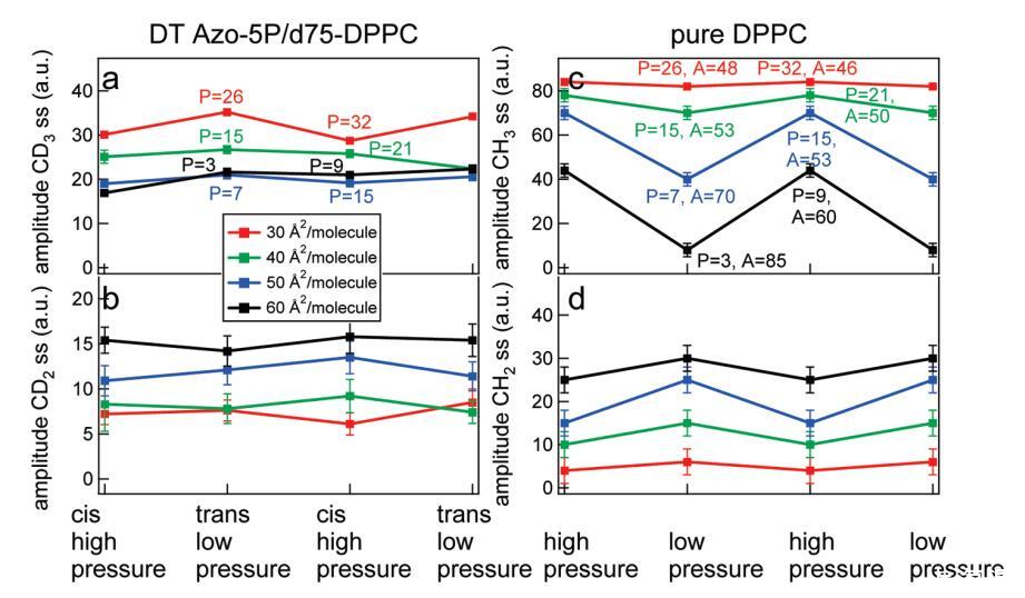 圖8.在d75 DPPC和DT Azo-5P(左)的5:1比率的實驗中,d75 DPPC和純正常DPPC(右)的擬合結果。(a)CD3對稱拉伸振動模式的振幅作為不同密度的光開關脂質狀態的函數;(b)CD2對稱拉伸振動模式的振幅作為不同密度的光開關脂質狀態的函數;右圖顯示了純DPPC的類似結果,壓力與左圖相似,其中(c)CH3對稱拉伸振動模式的振幅和(d)CH2對稱拉伸模式的振幅。共振的寬度和頻率在擬合中是固定的。