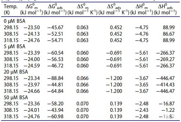 表2. [C10-4-C10im]Br2在不同溫度下吸附和膠束化的熱力學參數與BSA濃度的關系。