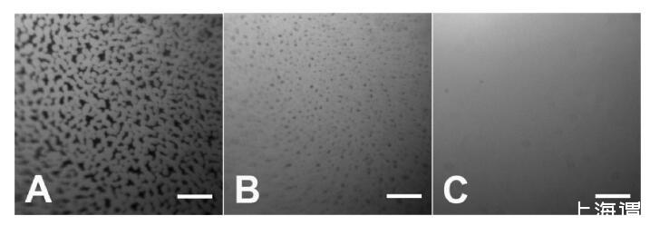 圖3。顯示異質(zhì)結(jié)構(gòu)域轉(zhuǎn)變?yōu)橥|(zhì)層的熒光圖像。C(HSA-TR)=PBS中的0.01 mg/mL,pH值7.2,離子強(qiáng)度=530 mM。(A)3、(B)8和(C)將蛋白質(zhì)溶液引入試驗(yàn)箱后36分鐘。標(biāo)尺:50μm。