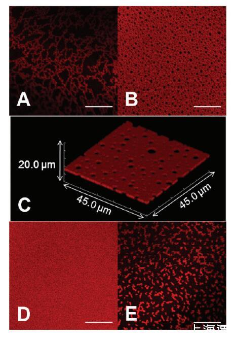 圖2。蛋白質(zhì)組裝的形態(tài),隨離子強(qiáng)度和還原劑的添加而變化。HSATR(0.01 mg/mL)在(A,B)PBS中的AWI下自組裝,pH值7.2,離子強(qiáng)度=53 mM和(C)在掃描體積為45.0*45.0*20.0μm3的情況下,呈現(xiàn)了與圖像B相同的溶液條件對(duì)應(yīng)的共焦圖像Z疊層。(D)PBS,pH值7.2,離子強(qiáng)度=530 mM。(E)30 mM DTT,pH 7.2,離子強(qiáng)度=53 mM的PBS。比例尺:20μm。