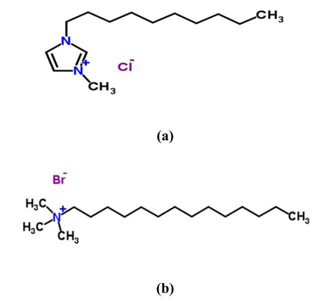 因此,牢記混合表面活性劑的上述優(yōu)點,已嘗試研究陽離子表面活性劑與表面活性離子液體在純水中以及在二甘醇(DEG)-水二元混合物存在下的混合膠束化,為了進(jìn)一步了解二甘醇對這些混合體系的影響。所使用的離子液體為1-癸基-3-甲基咪唑氯化物[C10min][Cl],陽離子表面活性劑為十六烷基三胺(CET),陰離子染料為甲酚紅(CR)(方案1)。ILs在兩相均相催化過程中也有廣泛的應(yīng)用,在這些催化過程中,含有催化劑的一相與含有反應(yīng)物和產(chǎn)物的第二相完全不混溶。正如我們所知,二甘醇是一種有機(jī)溶劑,因此大多數(shù)催化反應(yīng)被認(rèn)為發(fā)生在離子液體和有機(jī)溶劑的界面[26]。