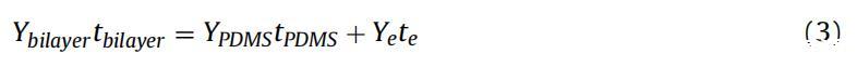 測量裸PDMS膜的楊氏模量后,將單層電極轉移到這些PDMS膜上。使用與裸PDMS膜相同的參數(shù)測定PDMS+電極雙層的楊氏模量。PDMS+電極雙層由兩個長度和寬度相等的粘附層形成,因此使用[33]計算電極楊氏模量: