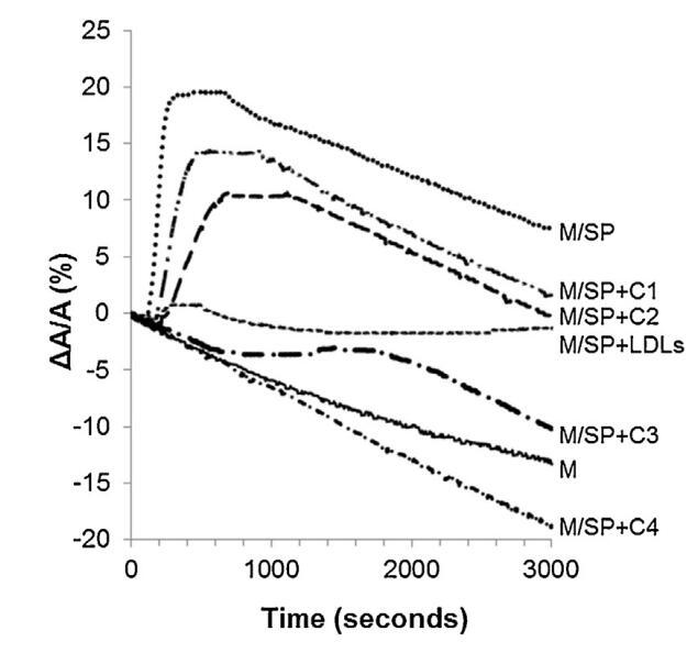 圖5。注入(…)后,由單層(M)覆蓋并在不含(-)額外分子的緩沖液上形成的界面的相對表面積隨時間的變化SP(26.6±1.5 mg蛋白質(zhì))、SP(26.6±1.5 mg蛋白質(zhì))和不同濃度(··-)C1、(·-)C2的脂質(zhì)體的混合物,(·-)C3和(·-)C4(分別為1.17±0.02 mg、2.18±0.02 mg、4.37±0.02 mg和6.55±0.02 mg脂質(zhì))和(---)LDL(4.6 mg PC)和SP(26.6±1.5 mg蛋白質(zhì))的混合物。空氣-緩沖界面處的溫度為34℃。表面壓力保持在25 mN/m。