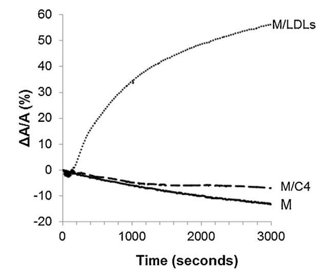 圖4。單層(M)所覆蓋的界面的相對表面積隨時間的變化,該單層(M)以25 mN/M的速度壓縮,并在不含任何額外分子(-)的緩沖液上形成,(…)LDL(4.6 mg PC)和(-)脂質(zhì)體C4(含4.8 mg PC)。空氣-緩沖界面處的溫度為34℃。