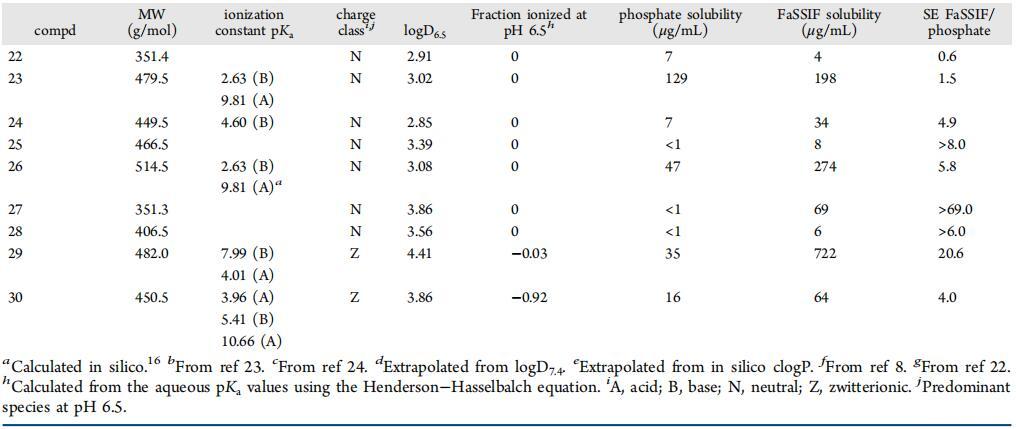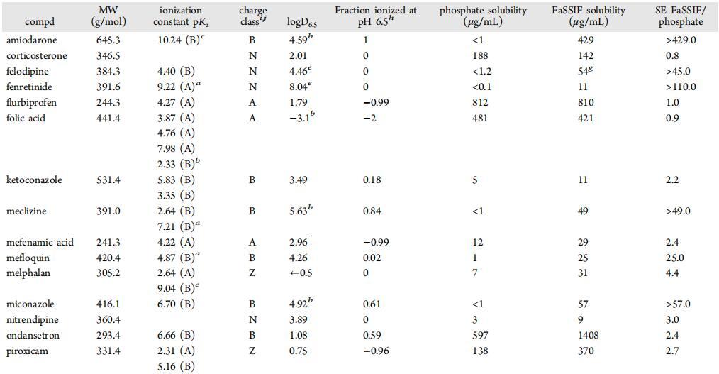 在FaSSIF和水性緩沖液中的溶解度評估和物理化學(xué)特性。選擇了一組21種上市藥物和30種來自不同研究項(xiàng)目的羅氏化合物,因?yàn)樗鼈冊趐H值為6.5的水性緩沖液和FaSSIF介質(zhì)中的溶解度不同。作為標(biāo)準(zhǔn)做法,所有溶解度和表面壓力剖面測量均在室溫下進(jìn)行,而不是在37°C下進(jìn)行。盡管溫度可能會影響藥物溶解度、脂質(zhì)聚集體分配和溶解,據(jù)報道,牛磺膽酸膠束的聚集數(shù)對溫度變化相對不敏感。19該化合物組包含不同的化學(xué)性質(zhì)、廣泛的親脂性,并涵蓋不同類型和程度的電荷狀態(tài),包括中性、酸性、堿性和兩性離子分子。表1列出了主要理化性質(zhì)和溶解度數(shù)據(jù)。