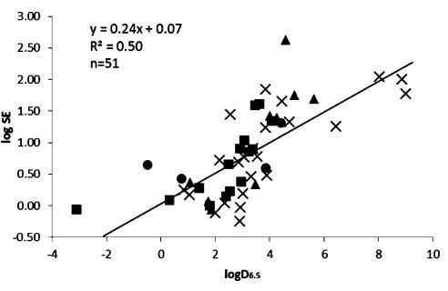 圖2。在pH值為6.5時,51種化合物的溶解度增強(qiáng)(SE=S_-FaSSIF/S_-水溶液)是辛醇/水分配系數(shù)的函數(shù)。化合物被歸類為酸(■),基地(▲),中性(×)和兩性離子(●).高于或低于檢測限的值在檢測限處繪制。