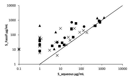 圖1。測定了51種化合物在磷酸鹽和FaSSIF緩沖液中pH值為6.5時的平衡溶解度。化合物被歸類為酸(■),基地(▲),中性(×)和兩性離子(●).線對應(yīng)于單位線。低于檢測限的值在檢測限處繪制。