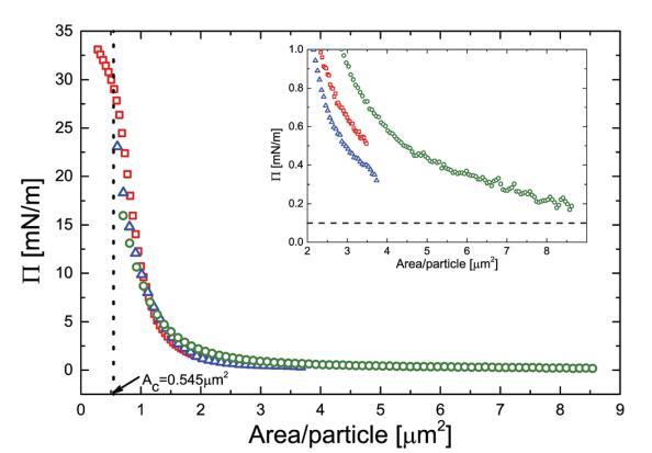 壓力-面積等溫線是通過在Langmuir槽上對擴(kuò)散單分子膜進(jìn)行3組不同實(shí)驗(yàn)得到的。這些等溫線中的面積坐標(biāo)根據(jù)吸附在界面上的顆粒數(shù)量進(jìn)行縮放。如圖1所示,所有曲線都折疊到一個圖上。在增加壓縮時,壓力最初略有變化,但低于2 mm2/顆粒時,壓力急劇增加。曲線的斜率首先增加,但在約27 mN m-1處達(dá)到最大值,在此有一個拐點(diǎn),然后是一個稍弱的斜率。如圖1中的虛線所示,對應(yīng)于該拐點(diǎn)的每粒子面積(Ac)值為0.545 mm2。假設(shè)粒子緊密堆積,這對應(yīng)于~835 nm的粒子間距離,遠(yuǎn)大于在本體溶液中測量的粒子流體動力學(xué)直徑(590 nm),表明粒子確實(shí)發(fā)生了實(shí)質(zhì)性變形。如圖1的插圖所示,0.5 mN m-1級的有限表面壓力(即遠(yuǎn)高于我們的檢測極限0.1 mN m-1)實(shí)際上已經(jīng)可以在約4 mm2的每粒子面積上測量。插圖還表明,在兩個不同的朗繆爾槽上進(jìn)行的不同實(shí)驗(yàn)之間,P的絕對值在0.3 mN m-1范圍內(nèi)可重復(fù)。