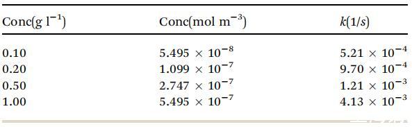 表2根據(jù)圖6中的實(shí)驗(yàn)曲線計算的各種濃度的速率常數(shù)k(1/s)值