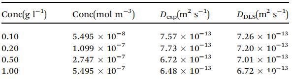 表1根據(jù)實(shí)驗(yàn)G與t1/2曲線計算的不同濃度的擴(kuò)散系數(shù)D(m2 s-1)值與使用DLS測量的值相比