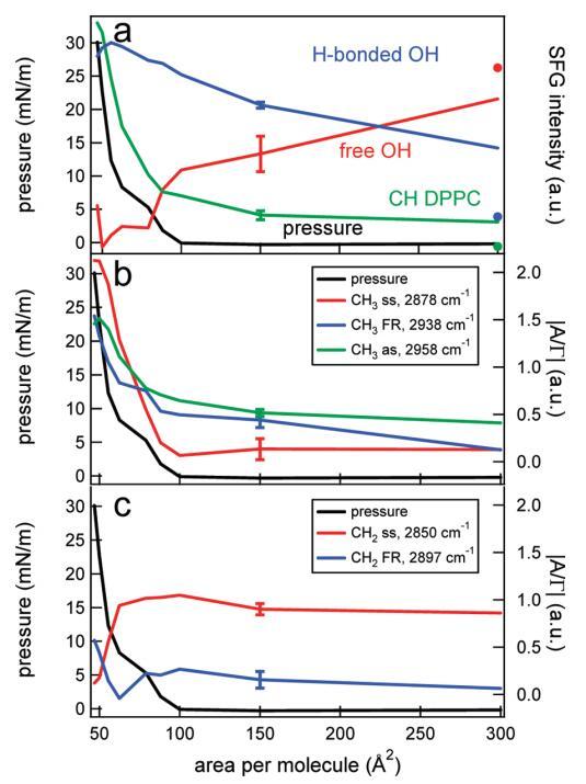 圖6。(a)DPPC的CH信號(綠色)、Hbonded OH信號(藍(lán)色)和游離OH信號(紅色)的表面壓力(黑色,左軸)和積分SFG強(qiáng)度(右軸)作為每個(gè)分子面積的函數(shù)。數(shù)據(jù)點(diǎn)是通過整合特定光譜區(qū)域獲得的,該區(qū)域由圖5的光譜中的彩色方塊標(biāo)記。純水層的CH、OH和游離OH面積(在表面活性劑攤鋪前測量)分別表示為綠色、藍(lán)色和紅色圓點(diǎn)。為清晰起見,集成SFG信號已被標(biāo)準(zhǔn)化,并且彼此略微偏移。(b)表面壓力(黑色,左軸)和不同CH3共振(右軸)的絕對振幅/帶寬比(|A/Γ|),通過使用洛倫茲線型模型擬合圖5中的數(shù)據(jù)獲得。(c)和b一樣,但是對于CH2共振。典型誤差條如圖所示。