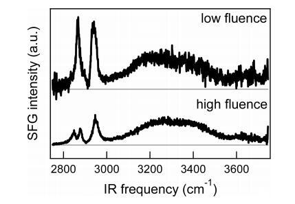 圖7。高密度水上DPPC的SFG光譜(SSP極化)(~每分子45?2)在低濃度下(~1.5 mJ/cm2)和高通量(~10 mJ/cm2),單脈沖加熱量分別在0.3至3°C(取決于紅外頻率)和2至19°C之間。為了清晰起見,對光譜進(jìn)行了偏移,并根據(jù)相對紅外強(qiáng)度進(jìn)行了縮放。注意,由于在高通量下發(fā)生的熱效應(yīng),形狀非常不同。這兩種光譜都是用非旋轉(zhuǎn)槽測量的。