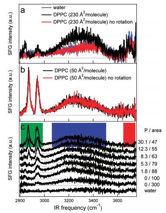 圖5。(a)DPPC在水上以230?2/分子(黑色)和不旋轉(zhuǎn)(紅色)槽的SSP極化的SFG光譜。樣品以這樣的方式旋轉(zhuǎn):在激光焦點(diǎn)處,樣品以~0.06 m/s。不旋轉(zhuǎn)時(shí),光譜與水相同?空中接口(藍(lán)色)。(b)在高密度(每個(gè)分子50?2)下,旋轉(zhuǎn)(黑色)和非旋轉(zhuǎn)(紅色)之間沒有區(qū)別。(c)裸露水面的SFG光譜(SSP極化)(底部光譜)和密度增加的水中DPPC的SFG光譜。壓力(mN/m)和每個(gè)分子的面積(?2)分別從底部到頂部增加和減少,在圖表旁邊給出。每個(gè)分子的面積由氯仿溶液滴的數(shù)量控制。彩色方塊標(biāo)記了圖6中使用的積分區(qū)域。本實(shí)驗(yàn)中使用了相對較低的紅外注量(1.5 mJ/cm2)。