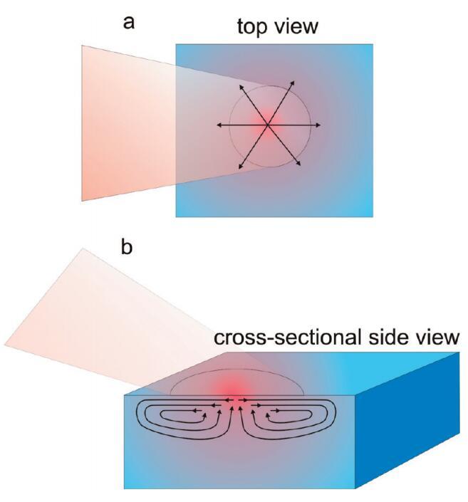 圖4。水樣近表面區(qū)域穩(wěn)態(tài)加熱引起的流動示意圖。溫度示意圖上用顏色表示,其中紅色表示熱,藍(lán)色表示冷。橙色陰影區(qū)域顯示入射到表面的激光束,箭頭表示溫度梯度誘導(dǎo)流動的方向。(a)俯視圖,顯示近表面區(qū)域的徑向位移,(b)橫截面?zhèn)纫晥D,顯示產(chǎn)生的Marangoni流動單元。請注意,在焦點(diǎn)的中心,水流向上,因此表面可以有效地持續(xù)更新。
