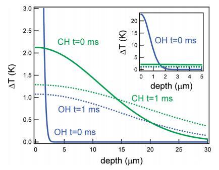 圖9。對于與CH(綠色)或OH(藍(lán)色)振動共振的紅外光束,溫度隨著進(jìn)入水層的深度而升高。實(shí)線和虛線分別表示t=0和t=1 ms。插圖顯示了相同的圖形,但帶有擴(kuò)展的yaxis。