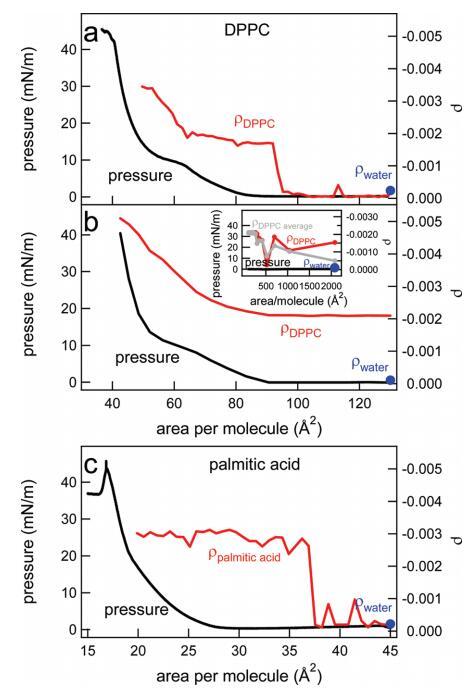 圖8。(a)在制備單分子層后,通過快速添加DPPC溶液持續(xù)壓縮單分子層,直到達(dá)到130?2的每分子面積,水上DPPC的表面壓力(黑色,左軸)和橢圓系數(shù)(紅色,右軸)。(b)水上DPPC的表面壓力(黑色,左軸)和橢圓系數(shù)(紅色,右軸)是每個(gè)分子面積的函數(shù)。通過逐滴添加更多DPPC,每次滴加間隔幾分鐘,改變了該區(qū)域。以這種方式達(dá)到的每個(gè)分子的最小面積為2000?2。插圖顯示了橢圓度系數(shù)(對于一個(gè)特定實(shí)驗(yàn)(紅色)和三個(gè)實(shí)驗(yàn)的平均值(灰色))以及非常低密度下的壓力。(c)在制備單分子層后,通過快速添加棕櫚酸溶液,直到達(dá)到每分子45?2的面積,連續(xù)壓縮單分子層期間,水上棕櫚酸的表面壓力(黑色,左軸)和橢圓系數(shù)(紅色,右軸)。在噴灑表面活性劑之前測量的純水橢圓度在每個(gè)面板中以藍(lán)色圓點(diǎn)表示。