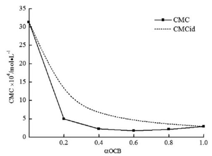 圖6。研究了實驗CMC、理想CMC與OCB摩爾分數的關系。