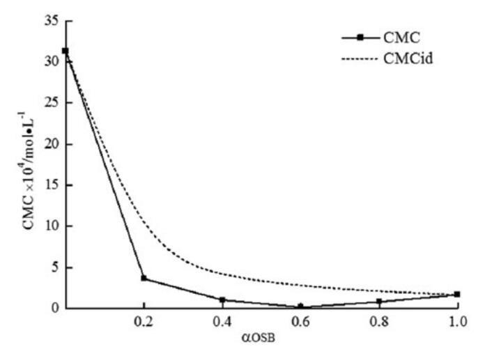 圖8。研究了實驗CMC、理想CMC與OSB摩爾分數的關系。