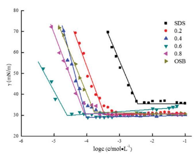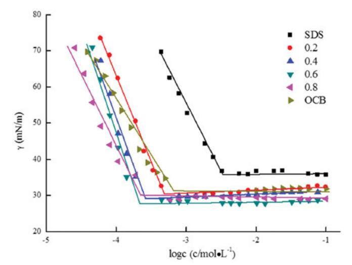 圖5。不同摩爾比下單獨OCB、SDS和混合OCB/SDS的表面張力與濃度對數的關系。