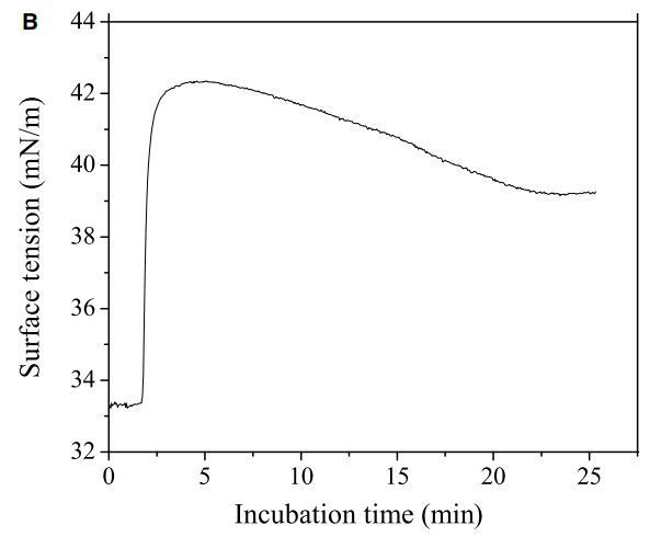 圖5:(A)使用活/死試劑盒測定的肽CL-7誘導A549細胞膜損傷的動力學。在不同時間點添加肽溶液后拍攝熒光圖像。計算綠色像素占總綠色和紅色像素的百分比,以估計細胞膜的完整性。(B)肽CL-7結(jié)合和插入引起脂質(zhì)單層的表面張力變化(DPPC/膽固醇/DPPS=50/10/2.5)。肽濃度保持在10 lM,脂質(zhì)單層的初始表面張力設定為33 mN/m。