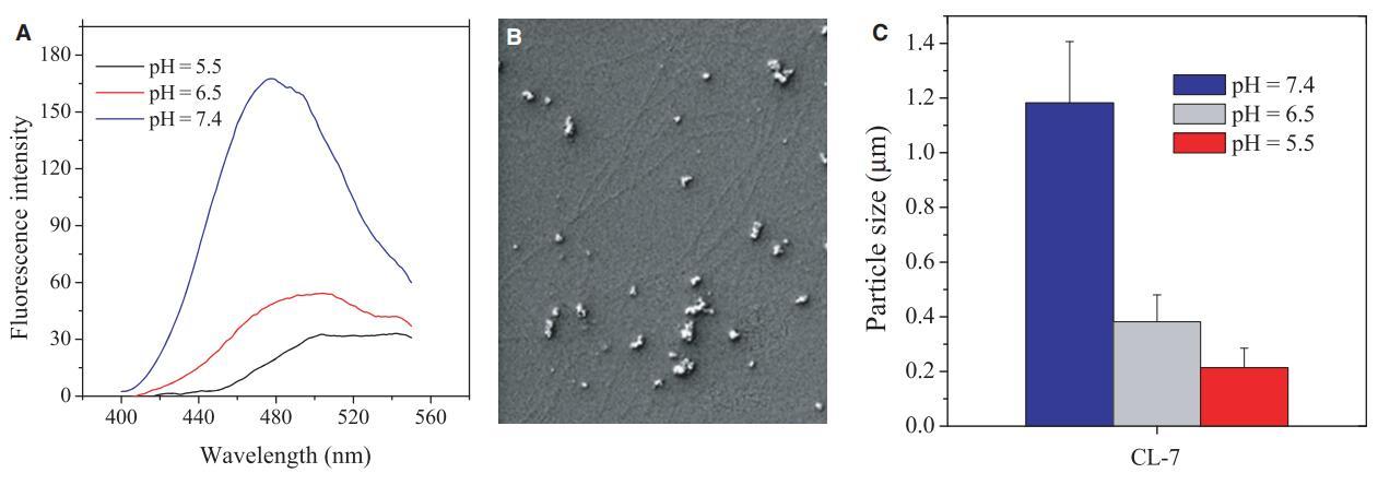 圖6:(A)pH值影響不同pH值下溶液(40 lM)中CL-7的聚集。1-苯胺基萘-8-磺酸(1,8-ANS)濃度固定在20 lM,激發(fā)波長設置為369 nm。肽聚集溶解通過1,8-ANS發(fā)射峰在500 nm處的紅移和熒光強度降低來指示;(B)pH=7.4的40 lM肽溶液中形成的CL-7聚集體的掃描電子顯微鏡圖像;(C)隔夜培養(yǎng)后測量溶液中肽CL-7(80 lM)的粒徑。數(shù)據(jù)代表至少三個獨立測試的平均值和標準差。