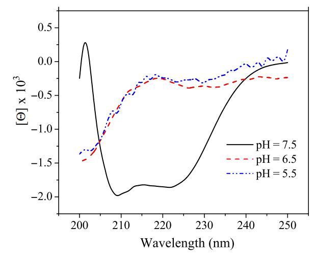 除了肽聚集狀態(tài)外,細胞表面pH值也可能影響pH敏感肽的二級結(jié)構(gòu)。已經(jīng)發(fā)現(xiàn),肽插入細胞膜通常伴隨著肽二級結(jié)構(gòu)的變化(17)。肽鏈折疊成特定構(gòu)象,通常為α螺旋結(jié)構(gòu),這被證明是肽插入細胞膜的必要過程(6)。盡管所有選定的pH敏感裂解肽在生理pH下均采用螺旋結(jié)構(gòu),但當環(huán)境pH降至肽的過渡pH以下時,它們變成隨機線圈(表2和圖7)。從無規(guī)螺旋轉(zhuǎn)變?yōu)槁菪请牟迦肽さ哪芰坑欣^程(6)。因此,細胞表面pH值也可能通過改變pH敏感肽的二級結(jié)構(gòu)而影響其活性。