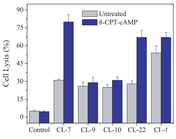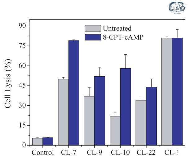 為了排除上述結(jié)果由CHO-K1細胞的某些固有特性引起的可能性,我們在另一個選定的細胞A549上進行了相同的實驗,其細胞表面電荷與CHOK1細胞幾乎相同(表1)。由于肽將受到來自A549和CHO-K1細胞的相同拉力,靜電吸引對肽-細胞相互作用的潛在影響被最小化或消除。A549細胞的表面pH值為7.15,高于肽CL-9、CL-10和CL-22的過渡pH值,但低于肽CL-7的過渡pH值(pH值為7.35)。同樣,CL-7被證明是A549細胞上最活躍的肽(圖3)。在存在8-CPT-cAMP的情況下,A549細胞的表面pH值降低至pH=6.55(表3),低于所有受試裂解肽的過渡pH值(表1)。因此,四種pH敏感裂解肽對8-CPTcAMP處理的A549細胞的裂解活性顯著增加(圖3)。應注意的是,與pH敏感肽不同,當細胞被8-CPT-cAMP處理時,pH不敏感肽CL-1對A549和CHO-K1細胞的活性幾乎沒有變化(圖2和圖3)。