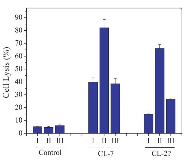 圖4:在CHO-K1細胞(I)、用8-CPT-cAMP處理的CHO-K1細胞(II)和用8-CPT-cAMP處理的CHO-K1細胞上測試的細胞表面pHs調(diào)節(jié)PH敏感裂解肽CL-7和CL-22的細胞裂解活性,然后是巴絲霉素A1(III)。表3提供了不同處理對應的細胞表面pHs。在所有實驗中,肽濃度固定在40 lM。對照組未添加肽。對照空白對照組和100%裂解對照組,將細胞裂解(乳酸脫氫酶釋放)標準化為細胞死亡百分比。數(shù)據(jù)代表至少三個獨立測試的平均值和標準差。