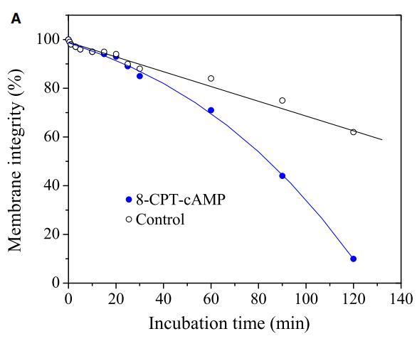 肽與細胞膜的相互作用包括三個步驟:(i)陽離子肽對細胞表面的靜電吸引;(ii)肽向結(jié)合平面的轉(zhuǎn)變;(iii)將肽插入細胞膜。通過研究pH敏感肽CL-7誘導的膜損傷動力學,研究了肽-細胞相互作用的細節(jié)(圖5A)。CL-7誘導的A549細胞膜滲漏呈時間依賴性,并呈線性曲線。盡管在8-CPT-cAMP處理的A549細胞上,CL-7介導的細胞膜損傷在開始時遵循相同的曲線,但它偏離了線性曲線,并在培養(yǎng)15-20分鐘后加速(圖5A)。在脂質(zhì)單層膜上進行的平行膜張力研究表明,CL-7與細胞膜的相互作用以表面張力快速增加的初始階段為特征,隨后是表面張力松弛的第二階段(圖5B),與肽與膜結(jié)合和肽插入相關(guān)膜,分別。盡管CL-7與脂膜結(jié)合是一個快速過程(3-5分鐘),但肽插入脂膜大約需要20分鐘才能完成。這兩個實驗的結(jié)果非常吻合,這意味著細胞表面pH對CL-7的顯著影響發(fā)生在肽-細胞相互作用的后期,即肽插入細胞膜。