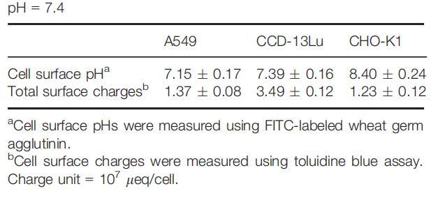 雖然細胞外環(huán)境通過影響細胞表面和整體溶液之間的質(zhì)子交換而影響細胞表面pH值,但在pH值固定的生理條件下,細胞表面pH值將由細胞的化學和生物學特性決定,包括細胞的質(zhì)子生產(chǎn)能力、細胞大小、細胞的大小、細胞的大小、細胞的大小、細胞的大小、細胞的大小、細胞的大小、細胞的大小、細胞的大小以及細胞的大小,以及細胞表面的pH緩沖能力。因此,在生理條件下,組織細胞可能具有特定的甚至可區(qū)分的表面pHs。我們測量了一組來自不同器官/組織的細胞在生理pH下的細胞表面pH值,發(fā)現(xiàn)所有受試細胞都具有不同的表面pH值(表1)。