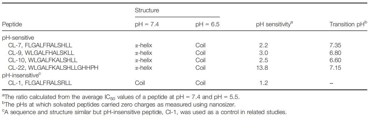 肽CL-1是一種pH不敏感的裂解肽(表2)。盡管其序列和結(jié)構(gòu)與其他pH敏感肽相似,但其細胞裂解活性幾乎不受pH的影響。本研究以肽CL-1作為陰性對照。