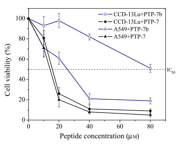 圖8:pH敏感肽PTP-7b(FLGALFKALSHLL)對正常-癌細胞對CCD-13Lu和A549細胞的細胞毒性(MTT試驗)。以pH不敏感肽PTP-7(FLGALFKALSKLL)作為對照。數(shù)據(jù)代表至少三個獨立測試的平均值和標準差。