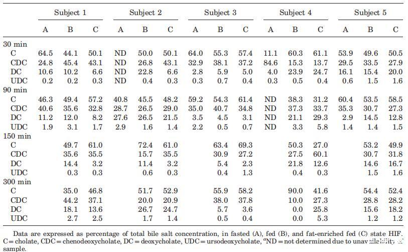 盡管在較低程度上,當檢查受試者的膽汁鹽池成分時,也觀察到了一種可變模式(表3)。膽酸鹽和鵝去氧膽酸鹽(結(jié)合膽汁鹽和未結(jié)合膽汁鹽之和)至少占總膽汁鹽庫的65%,脫氧膽酸鹽和熊去氧膽酸鹽(結(jié)合膽汁鹽和未結(jié)合膽汁鹽之和)雖然含量較少,但在每個樣本中都發(fā)現(xiàn)。文獻報道了禁食狀態(tài)HIF膽汁鹽池成分的主體間變異性。2,24在這些研究中,變異性主要是由于膽鹽與甘氨酸或牛磺酸結(jié)合,因為未結(jié)合的膽鹽僅占總膽鹽庫的不到3%。研究發(fā)現(xiàn),隨著時間的推移,個體內(nèi)膽汁鹽組成以及營養(yǎng)狀態(tài)之間的一致性相對較高,很少排除異常值(表3)。例如,對于S3和S5,在三種營養(yǎng)狀態(tài)下,在整個取樣時間內(nèi),相對膽鹽組成相當一致,而對于S4,膽酸的分數(shù)在38%和90%之間變化(表2)。