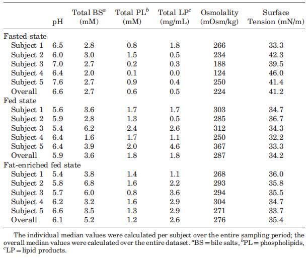 當考慮五個不同的受試者時,總膽汁鹽濃度隨時間的變化在所有三種營養(yǎng)狀態(tài)下都呈現(xiàn)波動模式(圖3)。無法定義可應用于每個單獨圖表的清晰的濃度-時間曲線。文獻中也報道了喂食條件下膽汁鹽濃度的高度變化。可以找到高達37 mM27和低至0.5 mM33的值;然而,文獻中觀察到的典型膽鹽濃度約為10mm,在進食后30–60分鐘檢測到。11,12,19,33在本研究中,攝入Sure Plus1后30分鐘,膽汁鹽濃度中值為8.3 mM;在高脂肪喂養(yǎng)狀態(tài)下,30分鐘后獲得的中值為11.9 mM。這些中值與文獻中觀察到的典型值一致。相比之下,五名登記受試者的單獨匯集腸道樣本顯示,在兩種喂養(yǎng)狀態(tài)下,總膽汁鹽濃度均低于5.3 mM。同樣在禁食狀態(tài)下,當不存在膽囊收縮刺激時,可以看到高度可變和時間依賴性的膽鹽濃度:濃度范圍為0.3至9.6 mM(圖3)。Lindahl等人的一項研究也描述了類似的高變異性。34作者報告了24名志愿者的禁食狀態(tài)膽鹽濃度,范圍在0.1至13.3 mM之間,總收集時間為150分鐘。Brouwers等人2和Perez de la Cruz Moreno等人24也報告了禁食狀態(tài)下的膽鹽濃度單個志愿者的小腸,分別為1.0至5.3 mM和0.5至5.5 mM。使用當前數(shù)據(jù)集計算的個體膽汁鹽濃度中位數(shù)顯示出較小的受試者間變異性,最小值為2.0 mM,最大值為3.0 mM;總體中值為2.6 mM(表2)。這些中值與禁食狀態(tài)下報告的膽鹽水平相當吻合:之前的文章描述了禁食狀態(tài)下總膽鹽濃度在2.0和5.9mm之間。11–13,19與當前設置中采用的120分鐘的總?cè)又芷谙喾矗诤笫鰣蟾嬷惺褂脝螘r間點測定來評估空腹水平。11–13,19