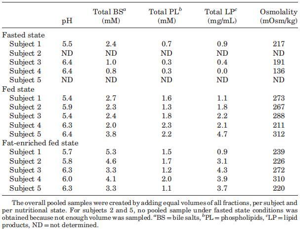 在本篇文章中,人類十二指腸內(nèi)容物在進食后的一段時間內(nèi)就幾種不同的腸道參數(shù)進行了表征,包括pH值、脂解產(chǎn)物、膽鹽、磷脂、滲透壓和表面張力。據(jù)我們所知,之前從未進行過攝入不同營養(yǎng)成分膳食后十二指腸液的受試者內(nèi)表征。由于研究方案可能在多個方面有所不同,并且由于不同類型的試驗餐在整個文獻的不同研究中使用,結(jié)果的比較并不總是簡單的。上述結(jié)果清楚地說明了所有檢查的腔內(nèi)參數(shù)在個體之間的高度可變性。此外,這些參數(shù)隨時間變化的波動增加了復雜性。因此,不能假設管腔內(nèi)成分隨時間的具體趨勢。這意味著餐后腸道內(nèi)容物的特征不容易在每個參數(shù)的單個值或時間曲線中呈現(xiàn);主體內(nèi)和/或主體間變化的重要性不會被提出。數(shù)據(jù)表明,通過報告單一代表性值,可變性將被掩蓋;匯集的HIF樣本以及計算的中隔的腔內(nèi)參數(shù)值通常與文獻中報告的典型值一致,這一事實證實了這一點。作為一個實際的折衷方案,最近有人提議使用三種不同的模擬腸液來表示餐后腸道環(huán)境。40腔內(nèi)參數(shù)值的變化可能是一組因素的結(jié)果,包括可變的胃排空、沿胃腸道的擴散、同時進行的消化和吸收以及不均勻分布的腸道內(nèi)容物。腸道液體可能分布到水袋28是最近的觀察結(jié)果,需要進一步研究。鑒于本研究中觀察到的變異性,可以建議增加志愿者人數(shù)。然而,估計用于檢測研究中每個物理化學參數(shù)存在差異的最小受試者人數(shù)并不容易,因為可變性水平隨參數(shù)而變化。