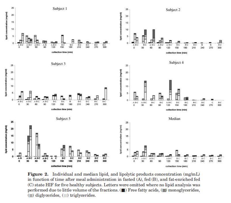 對于四名受試者(S2、S3、S4、S5),在禁食狀態(tài)HIF中發(fā)現(xiàn)微量脂質(zhì)(平均0.4?0.3 mg/mL),這與Armand等人12報告的受試者1十二指腸吸出物中的禁食水平0.6 mg/mL相符,禁食狀態(tài)下的脂質(zhì)濃度等于或高于30-120分鐘期間在喂食和富含脂肪的喂食狀態(tài)下測定的濃度(圖2)。這一觀察的可能原因可能與胃滯留時間和/或小腸上皮細胞的周轉(zhuǎn)率有關,從而釋放膜脂。在喂食和富含脂肪的喂食狀態(tài)之間,根據(jù)個體特征,沒有發(fā)現(xiàn)實質(zhì)性差異。然而,中位數(shù)曲線顯示,進食30分鐘后,在高脂肪喂養(yǎng)狀態(tài)下,總脂質(zhì)濃度顯著增加。由于沒有觀察到脂質(zhì)產(chǎn)物在管腔內(nèi)出現(xiàn)延遲,因此可以得出結(jié)論,服用液體膳食的脂肪含量的應用差異不會改變胃排空。先前已經(jīng)證明,給予恒河猴的碳水化合物、蛋白質(zhì)和脂肪等熱量負荷產(chǎn)生了相似的胃排空率,這表明胃排空是根據(jù)膳食的熱量密度進行調(diào)節(jié)的,而不管其營養(yǎng)成分如何。32