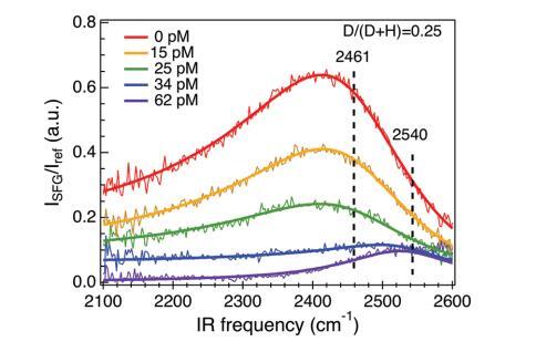 圖5。HOD在H2O中OD拉伸頻率窗口的光譜,給出了在diC14氨基單層下含有增加濃度DNA的磷酸鹽緩沖亞相。HOD的OD拉伸光譜只有一個(gè)單峰結(jié)構(gòu),并且清楚地表明,隨著DNA濃度的增加,共振振幅降低,共振向更高的頻率移動(dòng)。