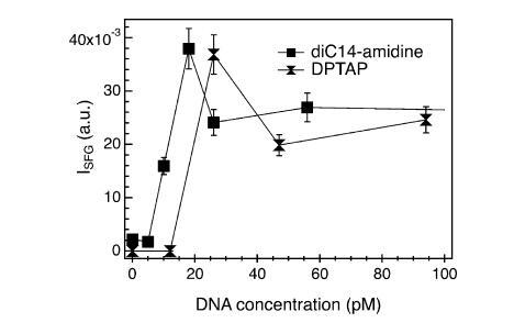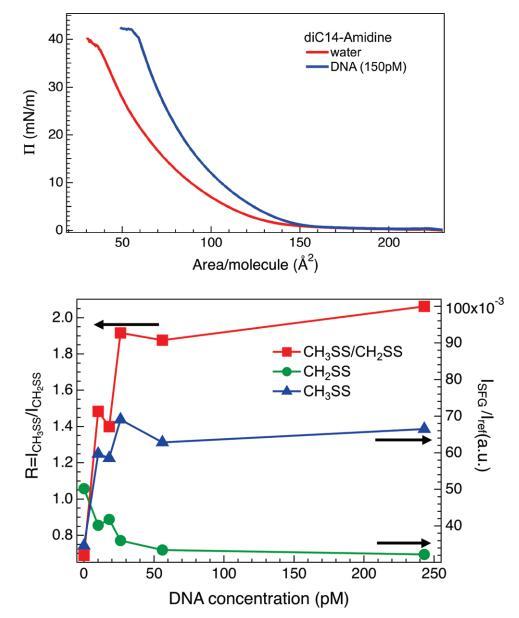 圖7。(上圖)在不存在(紅線)和存在(藍(lán)線,150μm)DNA的情況下,磷酸緩沖亞相上方的diC14氨基單層的π-面積等溫線。對于給定的脂質(zhì)密度,將DNA添加到亞相會導(dǎo)致表面壓力增加,或者相當(dāng)于脂質(zhì)分子的凝聚。(下圖)不同濃度的DNA溶液上的CH2SS和CH3SS共振(三角形和圓形,右軸)的VSF強(qiáng)度及其比率R(正方形,左軸)。實(shí)線是眼睛的向?qū)А?