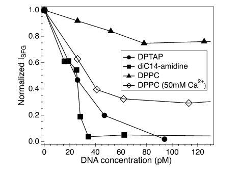 圖7(上圖)所示的壓縮等溫線清楚地表明,DNA對diC14氨基單層膜的影響,在很大的密度范圍內(nèi),是增加表面壓力,或等效地降低表面張力。也就是說,加入DNA后,表面生成的自由能總是變得更有利。然而,在沒有進(jìn)一步信息的情況下,這些實(shí)驗(yàn)幾乎無法深入了解表面熱力學(xué)變化的分子基礎(chǔ)。雙14-氨基單分子膜的CH區(qū)域的VSF光譜作為DNA濃度的函數(shù),以及由此產(chǎn)生的CH3SS/CH2 SS比率,提供了這樣的見解。如圖7(下圖)所示,向亞相添加DNA,即使在40 pM以下的體積濃度下,也會導(dǎo)致脂質(zhì)尾部順序的強(qiáng)烈增加。在解釋電子自旋共振研究的結(jié)果時(shí),貝納蒂及其同事曾認(rèn)為,吸附的DNA使凝膠相雙氰胺雙層(低于23°C)流態(tài)化,并使液相雙層(高于23°C)僵化,從而有效地平滑了在沒有DNA的情況下急劇的熱相變。91我們的光學(xué)和壓力等溫線測量都是在略低于熔融溫度的情況下進(jìn)行的。我們的壓縮等溫線表明,DNA的作用是增加表面上單個(gè)鏈之間的相互作用(降低表面張力),而光學(xué)測量表明,鏈相互作用的增加導(dǎo)致脂質(zhì)尾部更有序。有趣的是,這些結(jié)果與這樣一種情況是一致的,即DNA的加入似乎會產(chǎn)生脂質(zhì),兩者之間的相互作用比沒有DNA時(shí)更強(qiáng)烈,尾巴比沒有DNA時(shí)更有序,鏈的流動(dòng)性增強(qiáng)。這種脂鏈流動(dòng)性和脂鏈順序的解耦類似于之前觀察到的膽固醇和DPPC混合物隨溫度變化的情況。92