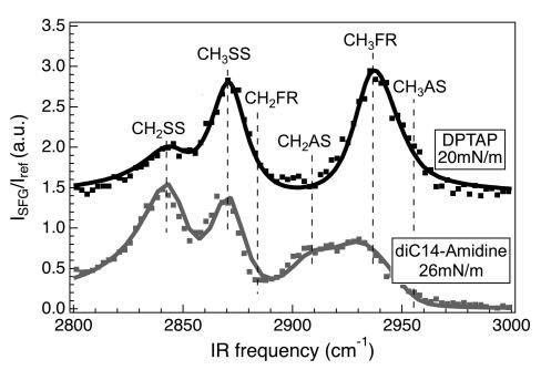 圖6。diC14 amdine在26 mN/m(灰色)下的SFG光譜(點(diǎn))和DPTAP(黑色)在20 mN/m下的SFG光譜(點(diǎn))。垂直線表示亞甲基對稱拉伸(CH2SS)、甲基對稱拉伸(CH3SS)、亞甲基非對稱拉伸費(fèi)米共振(CH2FR)、亞甲基非對稱拉伸(CH2AS)的位置,甲基對稱拉伸費(fèi)米共振(CH3FR)和甲基不對稱拉伸(CH3AS)。為清晰起見,DPTAP頻譜偏移。實(shí)體曲線使用洛倫茲模型擬合數(shù)據(jù)。