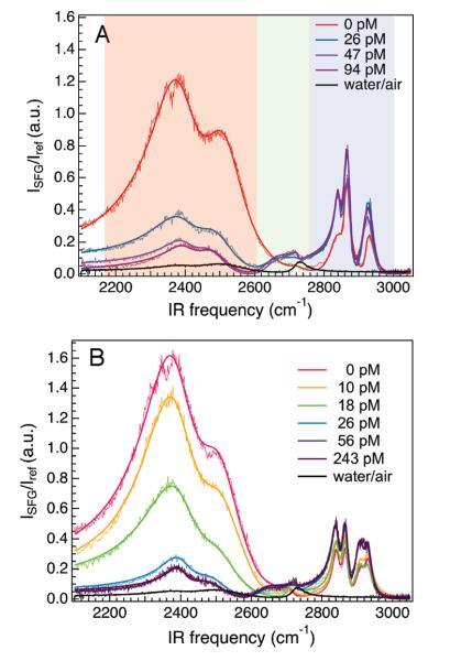 界面水的光譜響應(yīng)。圖2顯示了在2100-3100 cm-1范圍內(nèi),隨著亞相DNA濃度的增加,DPTAP、diC14氨基和DPPC單分子膜的VSF光譜。對這些數(shù)據(jù)的粗略檢查顯示出幾個(gè)特征。聚焦于圖2面板A,從低頻向高頻移動(dòng),很明顯,有一個(gè)巨大的雙峰結(jié)構(gòu),隨著DNA的加入,其振幅突然降低(透明的紅色矩形);一個(gè)小的、更高頻率的峰值(以≈2675 cm-1),隨著DNA(透明綠色矩形)的加入而增加;在2800-2950 cm-1的頻率范圍內(nèi)有幾個(gè)較窄的峰值(這些峰值是CH拉伸振動(dòng)的結(jié)果,顯示在一個(gè)透明的藍(lán)色矩形中,下面將進(jìn)一步討論)。
