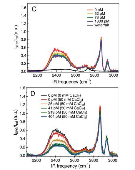 圖2。VSF光譜是OD拉伸區(qū)2100-2700 cm-1和CH拉伸區(qū)2850-2975 cm-1的DNA濃度的函數(shù)。陽離子脂質(zhì)單分子膜的脂質(zhì)密度為52?2/分子,兩性離子脂質(zhì)單分子膜的脂質(zhì)密度為47?2/分子。A組為DPTAP單層下的VSF光譜,B組為diC14氨基單層下的VSF光譜,C組為DPPC單層下的VSF光譜,D組為含有額外50 mM CaCl2的DPPC單層下的VSF光譜。所有實(shí)驗(yàn)中的亞相都是磷酸鹽緩沖的。每個(gè)面板中的單個(gè)光譜是具有不同濃度λ-DNA噬菌體的相同系統(tǒng)。每個(gè)面板中都顯示了該頻率窗口的磷酸鹽緩沖D2O光譜,以供比較。實(shí)體曲線使用公式1擬合數(shù)據(jù)。