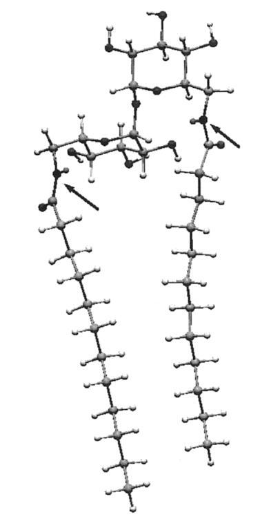 計算首先將海藻糖插入宏模型程序42,并對結構進行琥珀色能量最小化。從使用琥珀色*力場的25000個構象搜索中,我們選擇了能量最低的構象,該構象恰好與報告的X射線結構重疊。43,44接下來,該結構中的6-和6′-羥基被乙酰氨基取代。在模擬的水環境中,用AMBER*再次進行了25000次構象搜索。然后乙酰基被十二烷基取代,然后對生成的a-12雙子座進行了另一次搜索。結果表明,整個構象由酰胺羰基和相鄰葡萄糖環的2-羥基之間的兩個分子內氫鍵控制。氫鍵導致兩條全反式鏈彼此擺動約95°。A-12的固態紅外光譜證實了這種相互作用,該光譜顯示1646 cm-1處有羰基帶,而Hecameg的羰基帶為1700 cm-1,單體葡萄糖類似物的羰基帶為1698 cm-1。25由于這種構象會不切實際地排除分子內疏水締合,而且在任何情況下,羰基氫鍵位點的溶劑可能會淹沒在水中,我們故意不允許-CdO氫鍵,并重新計算。通過這種方式,我們得到了圖6。可以看到,一條鏈上大約有八個碳與其伙伴鏈的碳并排排列。N/N距離僅為7.4?,整體分子形狀為“管狀”。用另一種方式說,糖的頭基延伸的距離不比兩條鏈的寬度大多少,就像人們預期的一種易于堆積成雙層的化合物那樣。45因此,正如前面從實驗數據得出的結論,海藻糖更像是一個統一的頭基,而不是一個可以有效隔離鏈的長間隔基。